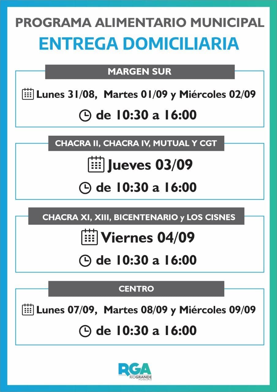 El Municipio de Río Grande, a través de la Dirección de Intervención Comunitaria, informa a los beneficiarios del ‘Programa Alimentario Municipal’ que, a partir de este lunes 31 de agosto, iniciará la entrega de los respectivos módulos a las familias, en los distintos puntos de la ciudad. Se recuerda que los módulos alimentarios serán entregados de manera personal en los respectivos domicilios a los beneficiarios, a los fines de respetar los protocolos para la prevención del COVID-19 y evitar la concentración de personas en oficinas públicas.