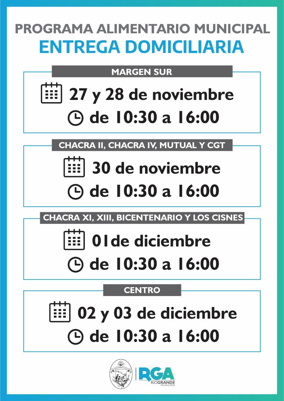 El Municipio de Río Grande, a través de la Dirección de Intervención Comunitaria, informa a los beneficiarios del ‘Programa Alimentario Municipal’ que, a partir de mañana viernes 27 de noviembre, iniciará la entrega de los respectivos módulos a las familias, en los distintos puntos de la ciudad.