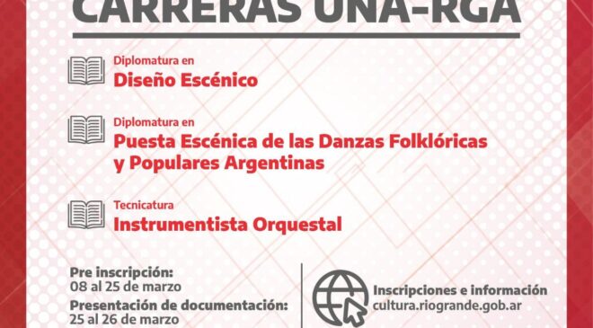 Las Carreras que dictará la UNA en Río Grande son la Diplomatura en Diseño Escénico (sonido e iluminación), la Tecnicatura Instrumentista Orquestal, y la Diplomatura en Puesta Escénica de las Danzas Folklóricas y Populares Argentinas, de la UNA. Cabe destacar que esta última Diplomatura se brinda, además, como ingreso a la Carrera de la misma temática que ofrecerá en el ciclo 2025.