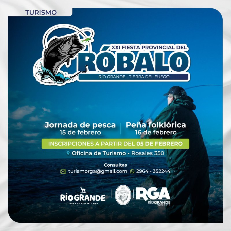El Municipio de Río Grande lleva a cabo la organización de la XXI edición de la Fiesta del Róbalo. Las inscripciones serán a partir del miércoles 5 de febrero, de manera presencial, en la Oficina de Información Turística que está ubicada en Rosales 350, dando posibilidad a pescadores de otras localidades de inscribirse a través del teléfono 2964-352244 o por correo electrónico turismorga@gmail.com.