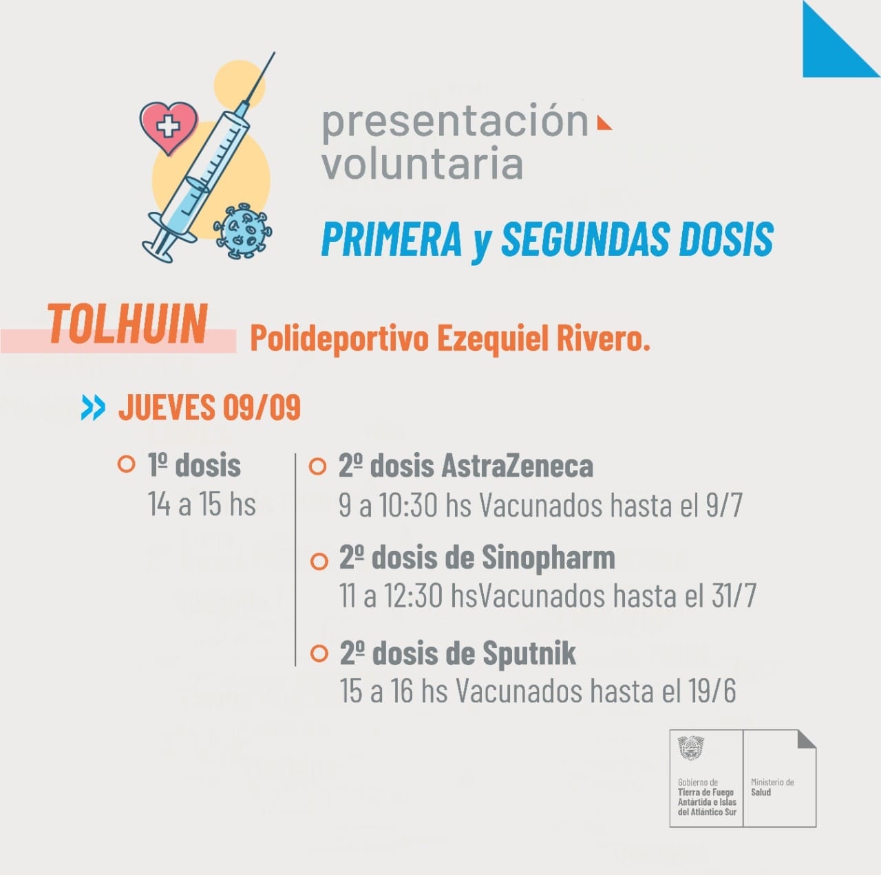 A fin de completar el esquema de vacunación contra el COVID-19, las vecinas y los vecinos de Tolhuin deberán acercarse al jueves 9 de septiembre al Polideportivo Ezequiel Rivero, de acuerdo al siguiente esquema: