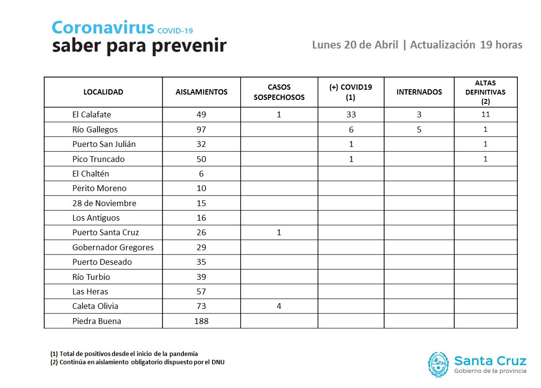 (*) Recibieron el alta definitiva once casos de El Calafate, uno de Río Gallegos, un caso de Puerto San Julián, un caso de Pico Truncado al dar negativo el control dos muestras posteriores.