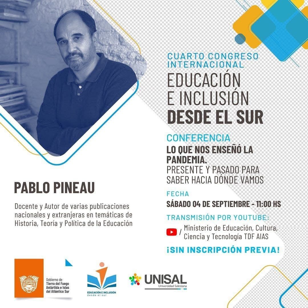 Este sábado por la mañana, el Ministerio de Educación, Cultura, Ciencia y Tecnología de la provincia de Tierra del Fuego, AeIAS, a través de la Dirección Provincial de Formación Permanente, llevó a cabo la segunda conferencia denominada «Lo que nos enseñó la pandemia: Presente y pasado para saber hacia dónde vamos» a cargo del docente y autor de varias publicaciones nacionales y extranjeras en temáticas de Historia, Teoría y Política de la Educación, Pablo Pineau.