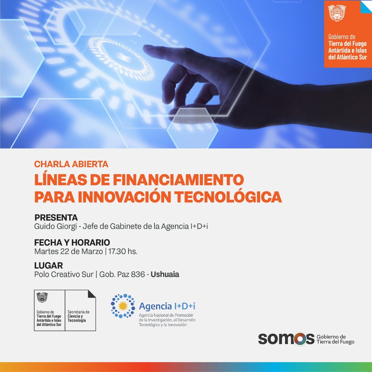 La Secretaría de Ciencia y Tecnología dependiente del Ministerio de Educación, Cultura, Ciencia y Tecnología , invita a toda la comunidad de la UNTDF a la charla a cargo del Jefe de Gabinete de la Agencia I+D+i Guido Giorgi. La charla se llevará a cabo en el Polo Creativo Sur (Gobernador Paz 836, Ushuaia) el próximo martes 22 de marzo a las 17:30hs.