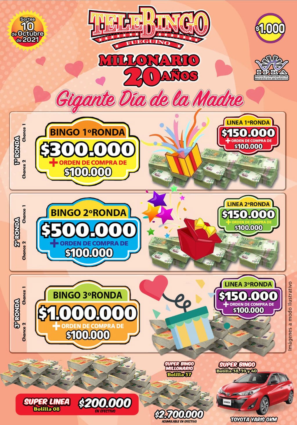 “El valor del cartón será de 1000 pesos” comenzó “Las 3 líneas pagara 250 mil, el 1° bingo 300 mil, el 2° 500 mil y el 3° bingo 1 millón” aseguro.