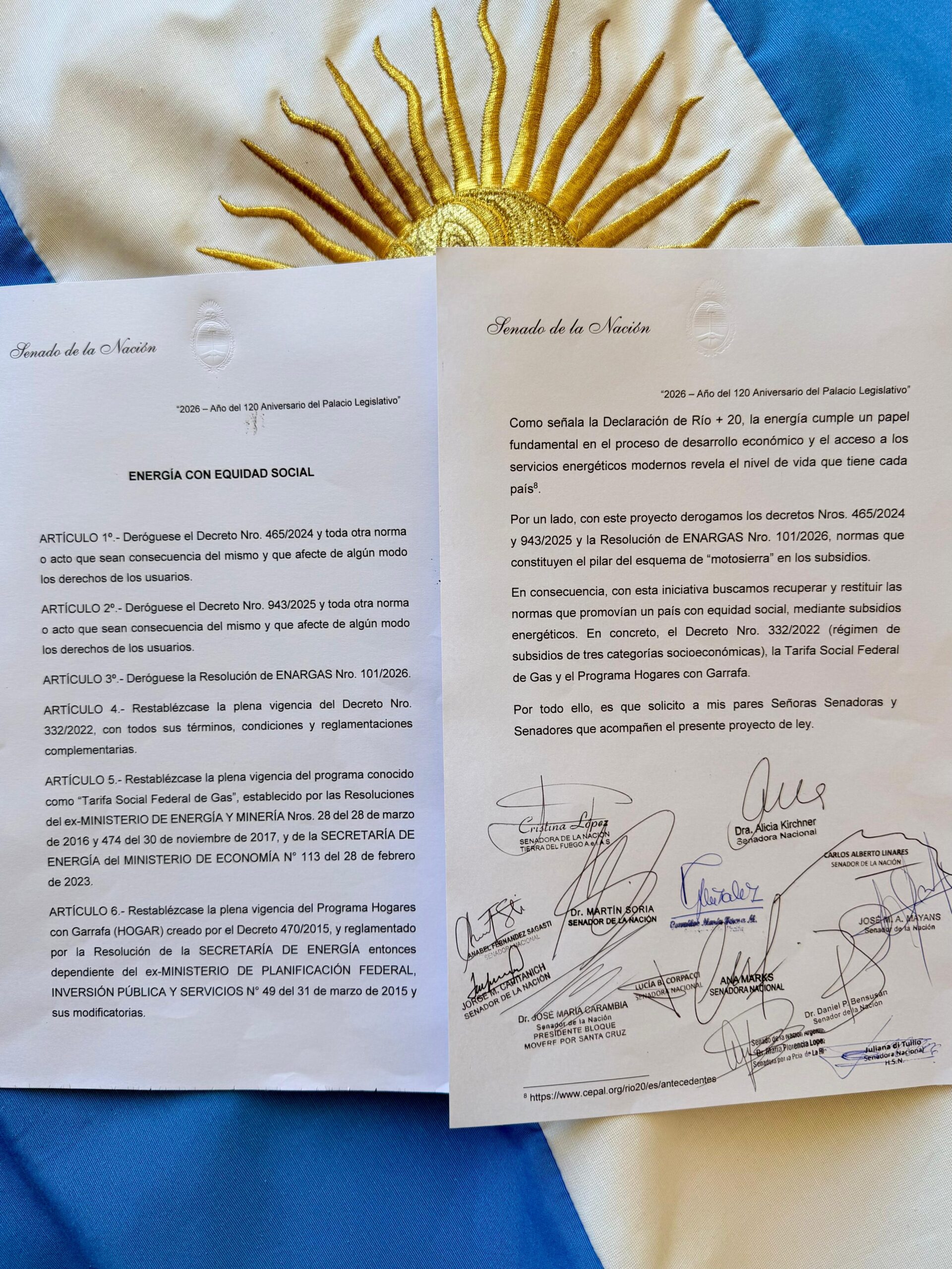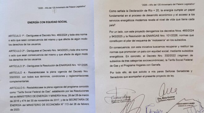 La iniciativa propone derogar el Decreto 465/2024, el Decreto 943/2025 y la Resolución 101/2026 del ENARGAS, normas que conforman el nuevo esquema de subsidios energéticos implementado por el gobierno del presidente Javier Milei.