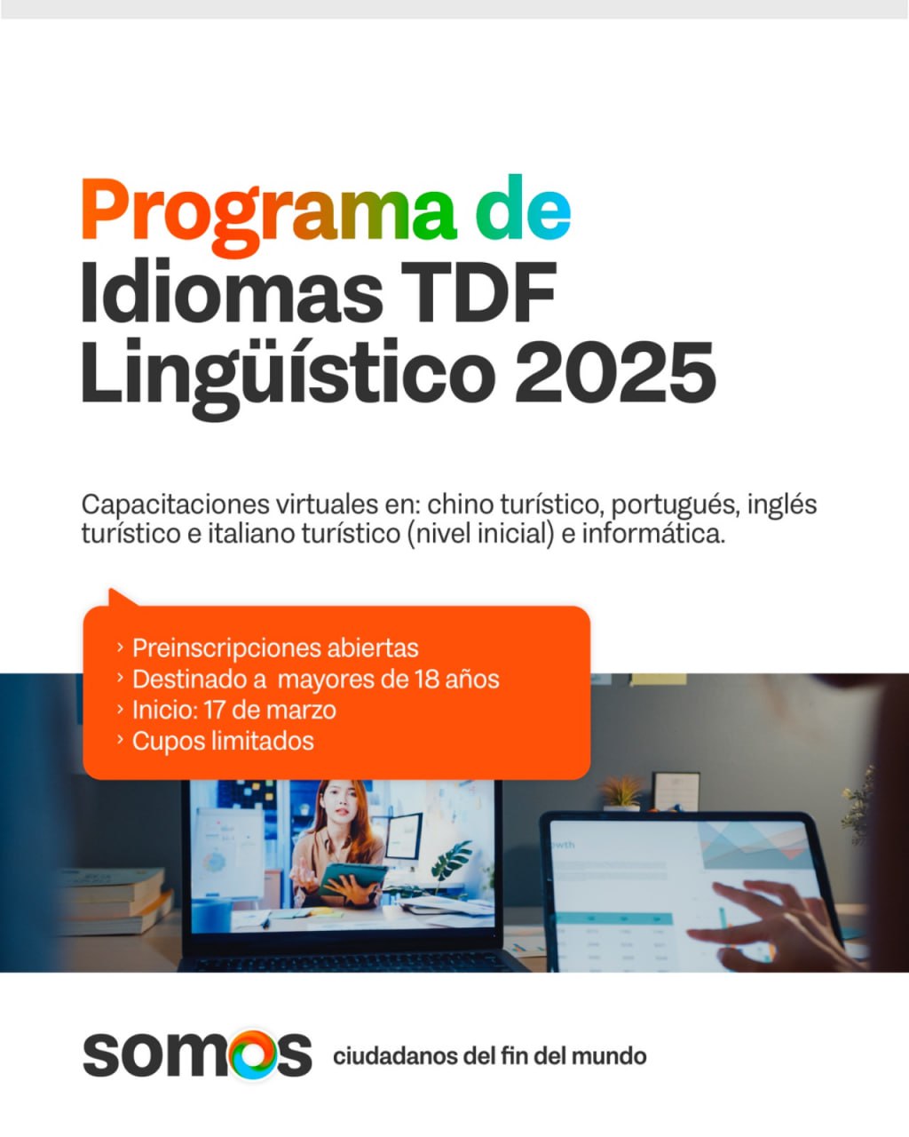 El Ministerio de Trabajo y Empleo de la provincia, a través de la Secretaría de Empleo y Formación Laboral, inicia las preinscripciones al “Programa de Idiomas TDF Lingüístico”, una iniciativa destinada a personas mayores de 18 años, interesadas en fortalecer sus habilidades en lenguas extranjeras con un enfoque específico en el turismo.