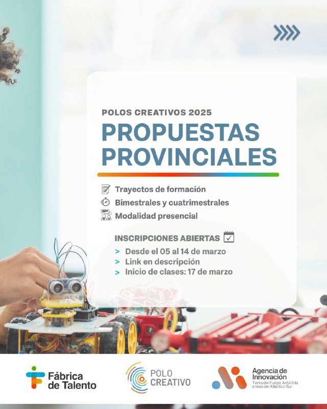 La Agencia de Innovación de Tierra del Fuego, a través de la Secretaria de Gestión, Polos y Fabricas de Talentos, informa que desde el día 5 hasta el 14 de marzo se realizarán las inscripciones para las actividades anuales de los polos creativos de las tres ciudades.