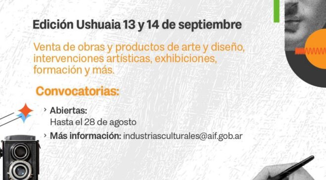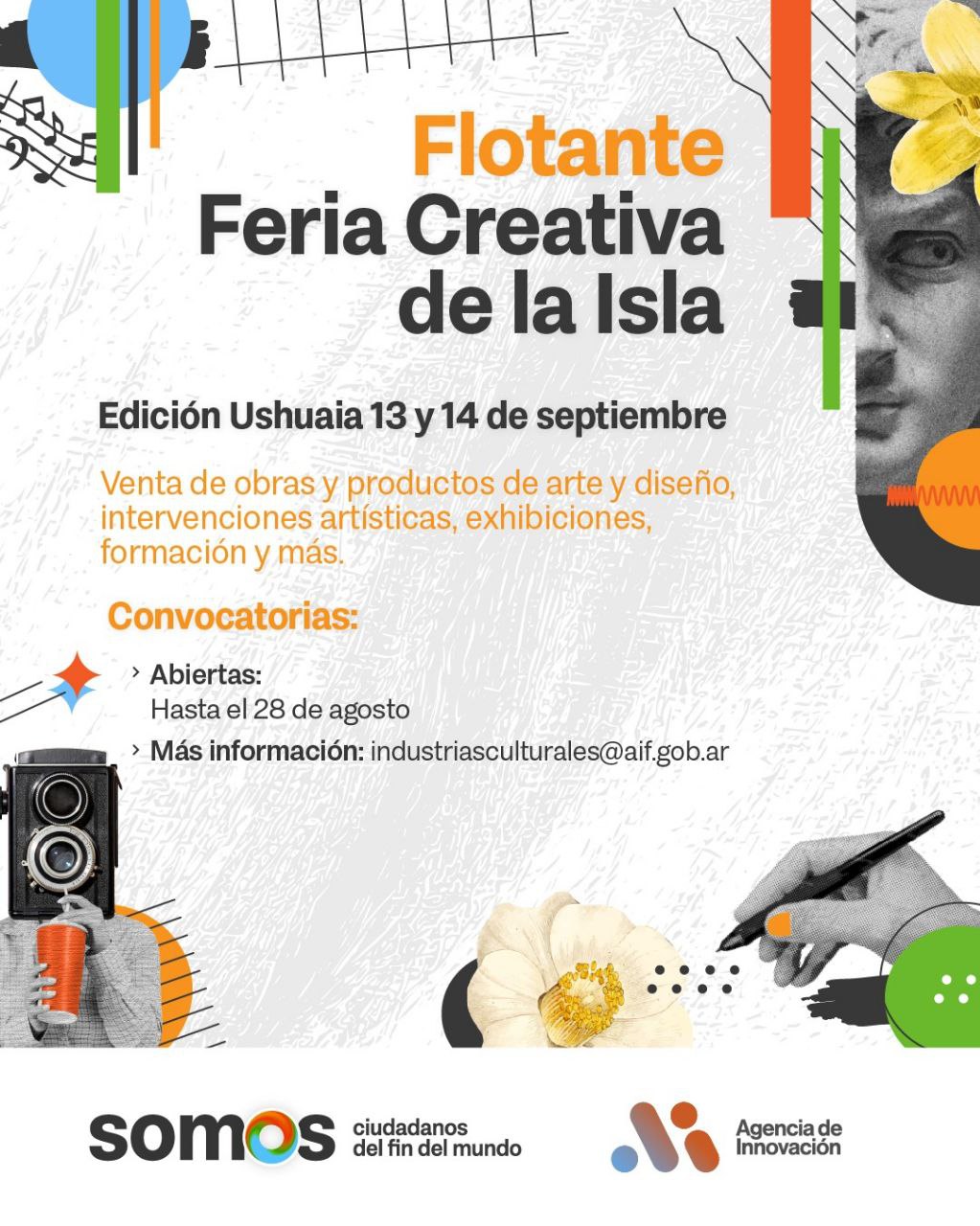 La Secretaría de Cultura invita a artistas, productores y creativos a la convocatoria de “Flotante, feria creativa de la isla”, en la que se llevará a cabo la venta de obras y productos de arte y diseño, intervenciones artísticas, exhibiciones entre otras actividades durante el mes de septiembre. En esta oportunidad, el evento se realizará en la ciudad de Ushuaia.