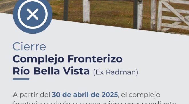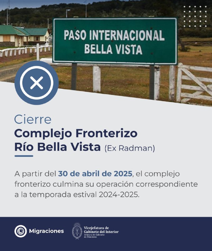 La Secretaría de Protección Civil informa que a partir de mañana 30 de abril a partir de las 12 del mediodía el Paso Fronterizo Bella Vista (ex Radman) culmina su operación correspondiente a la temporada 2024 – 2025 y permanecerá cerrado hasta la próxima temporada con fecha a definir.