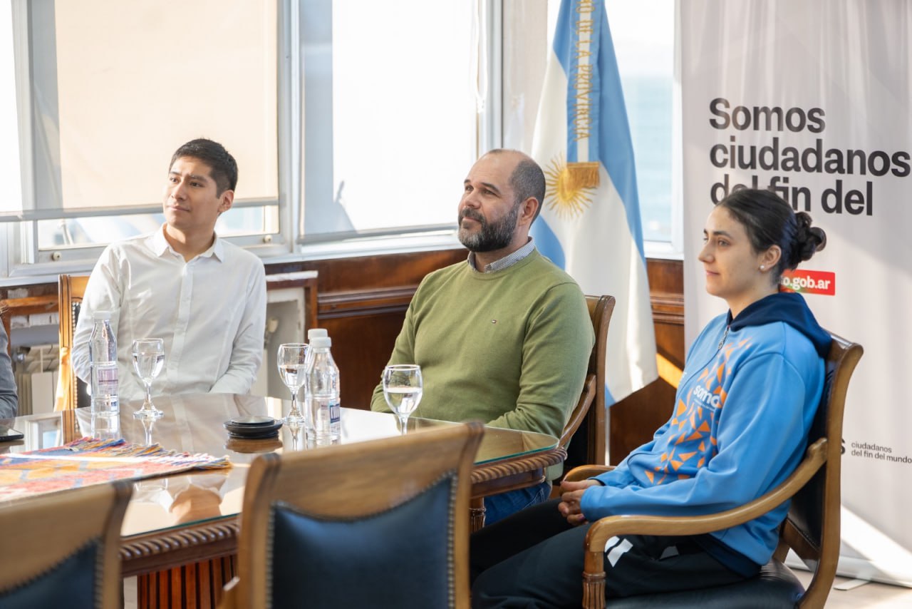 Luego de la reunión el Gobernador y el Ministro Jefe de Gabinete entregaron a los deportistas banderas de la Provincia. Acompañaron el Secretario de Deportes, Matías Runín, el Subsecretario de Deportes, Gabriel Coto y la Subsecretaria de Deportes Zona Sur, Natalia Muñoz.