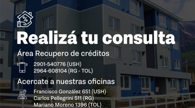 Quienes estén interesados en conocer los beneficios que brinda el Programa pueden acercarse a las oficinas ubicadas en: Río Grande, Carlos Pellegrini 511; Tolhuin, Mariano Monero XXX; o Ushuaia en Francisco González 651. o bien comunicarse al sector Recupero de Créditos a los números: 2964-608104 para las ciudades de Río Grande y Tolhuin y al 2901-540776 en Ushuaia.