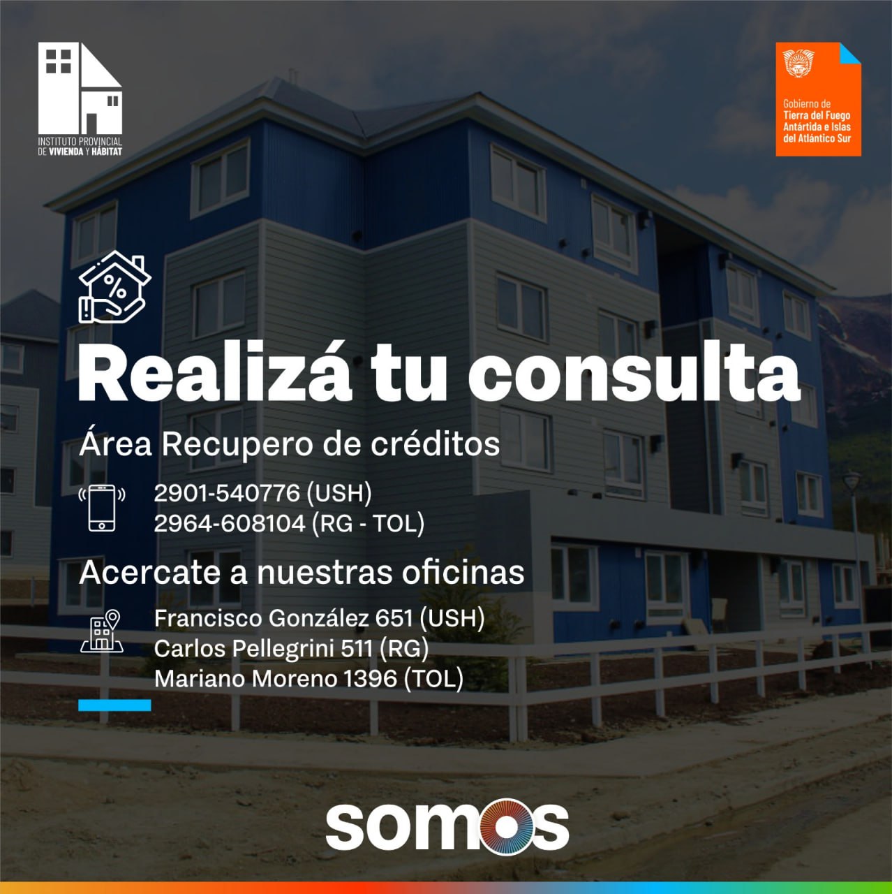 Quienes estén interesados en conocer los beneficios que brinda el Programa pueden acercarse a las oficinas ubicadas en: Río Grande, Carlos Pellegrini 511; Tolhuin, Mariano Monero XXX; o Ushuaia en Francisco González 651. o bien comunicarse al sector Recupero de Créditos a los números: 2964-608104 para las ciudades de Río Grande y Tolhuin y al 2901-540776 en Ushuaia.