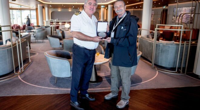 El Presidente de la Dirección Provincial de Puertos (DPP), Roberto Murcia, concretó la entrega de una placa de recibimiento al capitán del Buque Silver Nova, el cual arribó por primera vez al Puerto de Ushuaia, siendo así el primero de la Argentina en el que amarra.