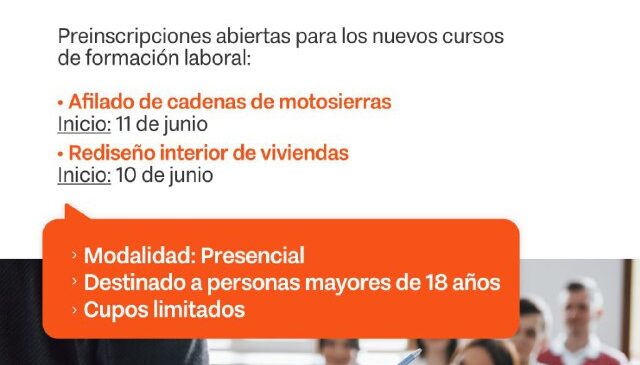 La primera propuesta es el Taller de Afilado de Cadenas de Motosierras, que se desarrollará en el SUM del Camping Hain (calle Gendarmería Nacional y Cabecera del Lago Fagnano, al lado del Museo Histórico Kami). Tendrá una duración de cuatro encuentros. Las clases se llevarán a cabo del 11 hasta al 21 de junio y se dictarán los miércoles de 19 a 21 horas y sábados de 10 a 13 horas. Esta capacitación cuenta con el auspicio de Construsec, tienda de materiales para la construcción.