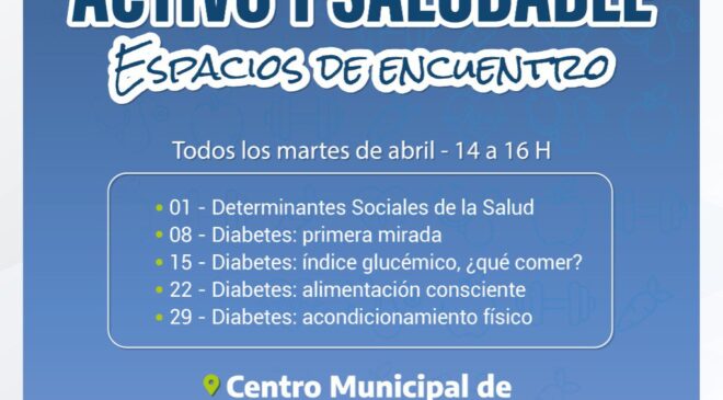 El primer encuentro se realizará este martes 1 de abril, durante el cual los participantes aprenderán sobre “Los determinantes sociales de la Salud”. La próxima charla se llevará adelante el 8 bajo el tópico “Diabetes: primera mirada”; luego el 15 se hablará sobre “Diabetes: índice glucémico, ¿Qué comer?”. El 22 el encuentro será en torno a la “Diabetes: alimentación consciente». Finalmente, el 29 de abril se cerrará con un charla sobre “Diabetes: acondicionamiento físico”.