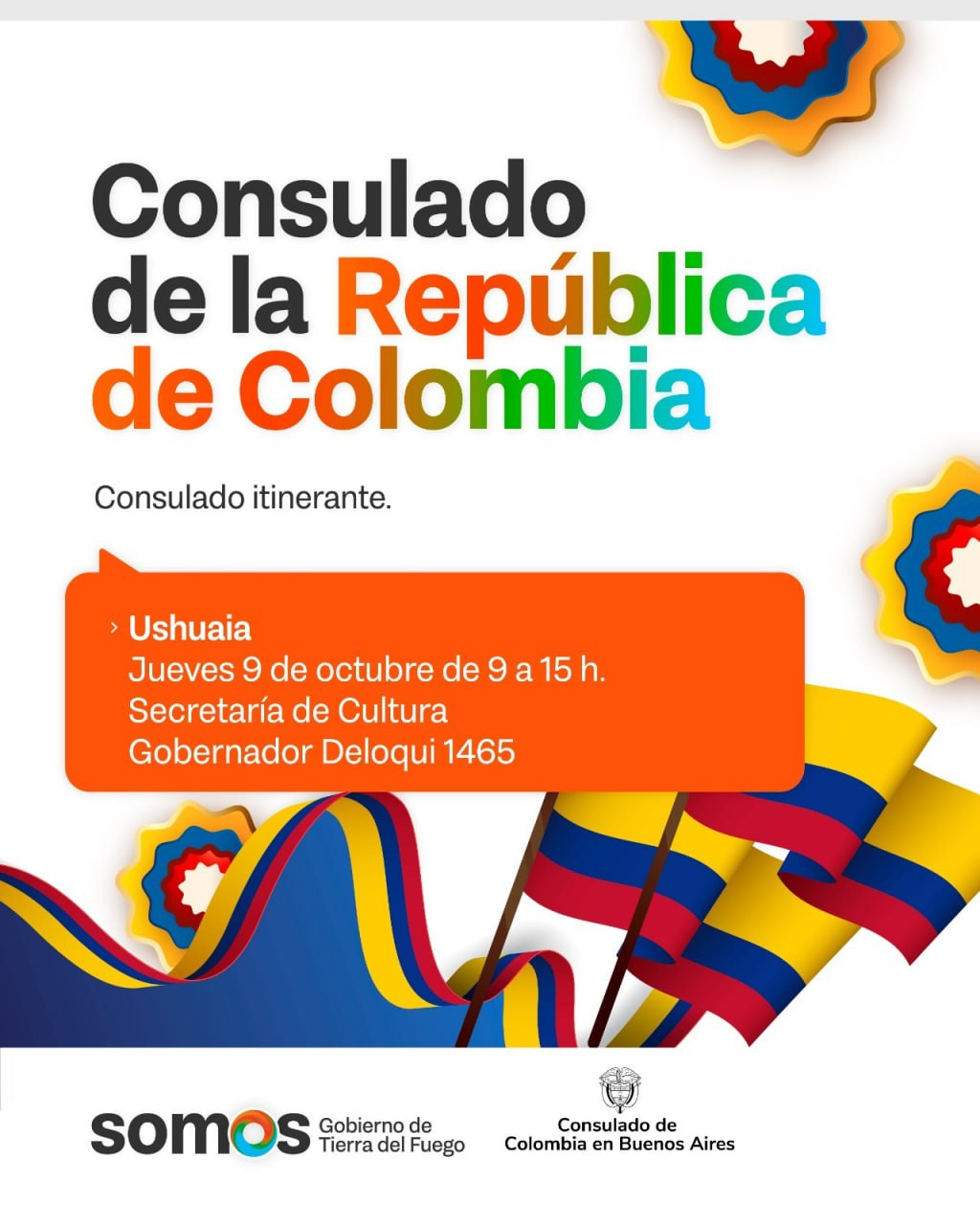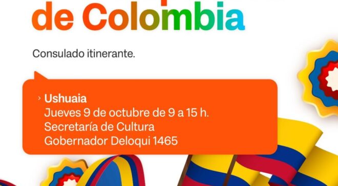 La Secretaría de Malvinas, Antártida, Islas del Atlántico Sur y Asuntos Internacionales del Gobierno provincial informa que el próximo jueves 9 de octubre se realizará una jornada de Consulado Itinerante de la República de Colombia en la ciudad de Ushuaia. La misma se desarrollará en las instalaciones de la Secretaría de Cultura, ubicada en Deloqui 1465, de 09 h. a 15 h.