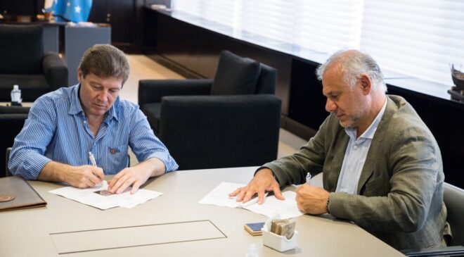 El Gobernador de Tierra del Fuego AeIAS, Gustavo Melella, junto a Luis Galli, presidente y CEO del Grupo NewSan, firmaron un acuerdo de cooperación mutua para dotar de más infraestructura al cultivo de mejillones en Almanza. El convenio contempla la construcción de un muelle modular flotante y de una base de operaciones, que favorece a la producción de mejillones, en el marco de la ampliación de la matriz productiva que viene llevando adelante el gobierno provincial.