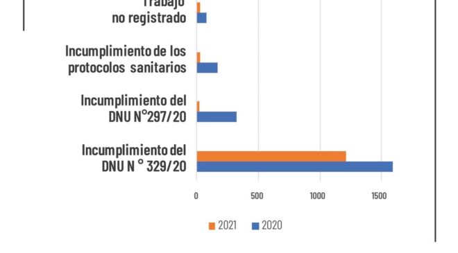 Las temáticas predominantes en las denuncias tramitadas son: Incumplimiento al DNU 329/20 sobre Prohibición de Despidos que alcanzó al 94 %; Incumplimiento al DNU 297/20 que establece el Aislamiento Social Preventivo y Obligatorio (ASPO) el 1,5%; Incumplimiento de Protocolo Sanitario 2,1% y por último Trabajo no Registrado que representa el 2,4% del total.