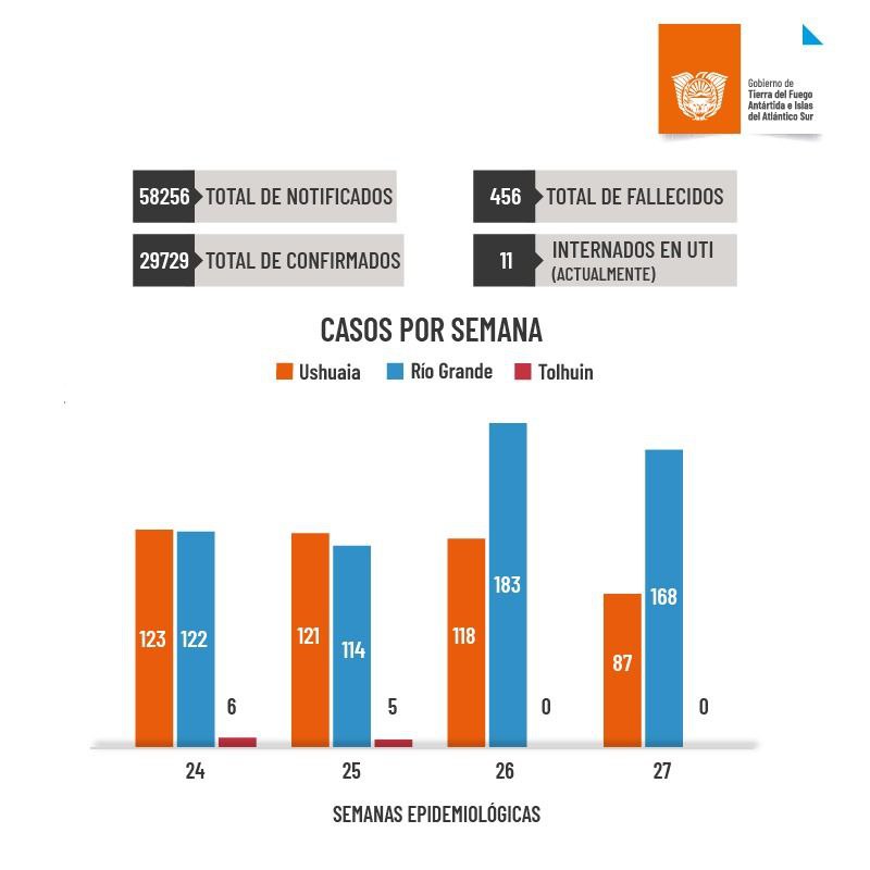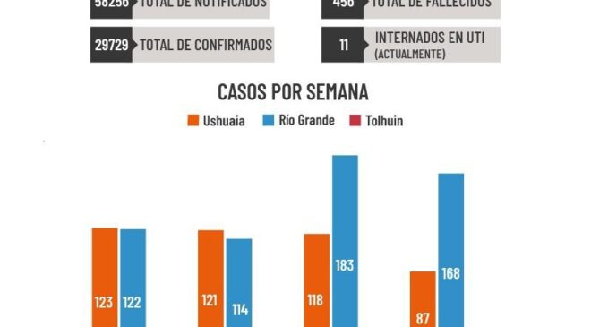 En la última semana se detectaron 87 casos nuevos en Ushuaia, 168 en Río Grande y 0 en Tolhuin. Actualmente hay 11 pacientes internados en UTI en toda la Provincia. El número de altas desde el inicio de la pandemia asciende a 29.054. Hay en el día de la fecha 219 casos activos en Tierra del Fuego.