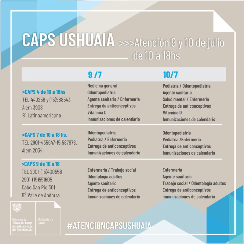 Las autoridades del Ministerio de Salud dieron a conocer cómo será la atención del servicio de Salud a través de los Centros de Atención Primaria de Salud para el viernes 9 y sábado 10 de julio, atenderán los CAPS Nº 4, 7 y 9, en el horario de 10 a 18, en distintas especialidades.