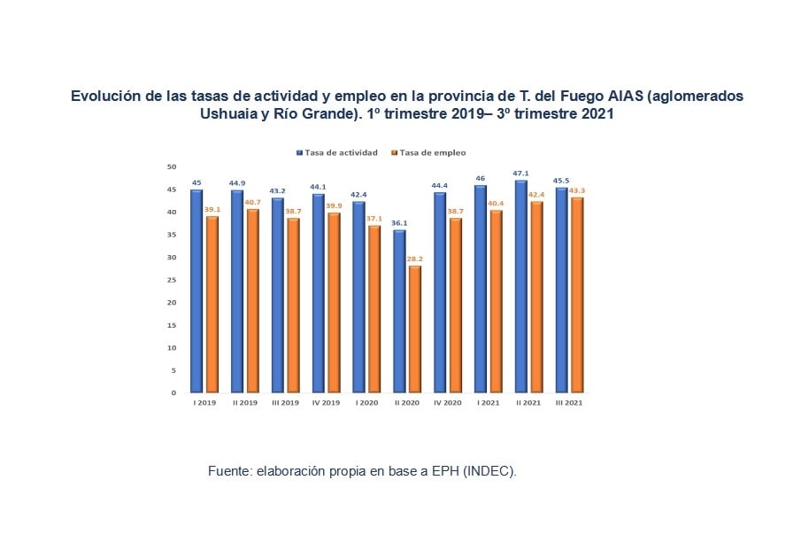 Tras el rebote de la economía en el segundo semestre del 2020, la recuperación de la actividad se estancó en los primeros meses del 2021. Sin embargo, durante julio y agosto el proceso de recuperación se aceleró superando incluso las proyecciones para el mismo año. Alcanzando también niveles superiores a los previos a la pandemia, siendo protagonistas fundamentales en este proceso la industria y la construcción. Cerrando el tercer trimestre del 2021 con un 4.8% de desocupación en Tierra del Fuego.