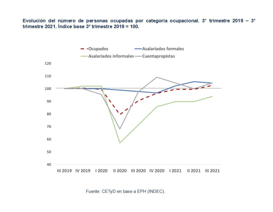 Las políticas públicas nacionales de sostenimiento de empleo implementadas, como la prohibición de despidos, los programas ATP y REPRO, la reducción de contribuciones patronales y las suspensiones con el pago del 75 % del salario, lograron mitigar el impacto de la crisis en el sector formal, no así en las ocupaciones más precarias e inestables, los sectores de la actividad trabajo doméstico y los trabajadores de oficio, en resumen, los trabajadores no esenciales.
