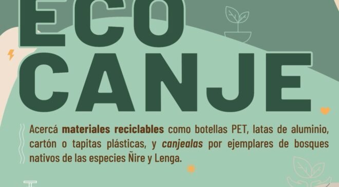 La propuesta invita a los vecinos y vecinas a acercarse con materiales reciclables, como botellas PET, latas de aluminio, cartón o tapitas plásticas, que podrán canjear por ejemplares de Bosques Nativos de las especies Ñire y Lenga.