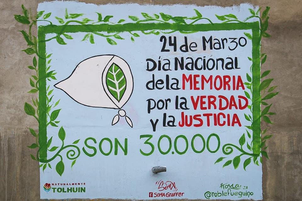 “Las artistas tolhuinenses Hona Roth y Lioren Burgo Wallner realizaron el mural de la Memoria sobre calle Lucas Bridges, gracias a que la familia Zurita nos brindó el espacio”, indicó Soledad Gorostegui, Directora de Cultura y Educación.