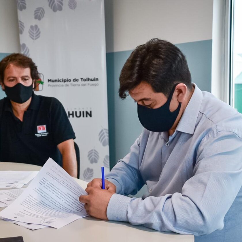El Intendente Daniel Harrington, el Secretario de Producción, Innovación e Inversiones, Lic. Eduardo Ibarra, y el Director de Producción, Ramón Subiabre, participaron de la firma del convenio con el INTA acompañados del Jefe A.E.R. Ushuaia, Ing. Ftal Fabián Boyeras, para la realización de la primera experiencia de Cría Municipal.