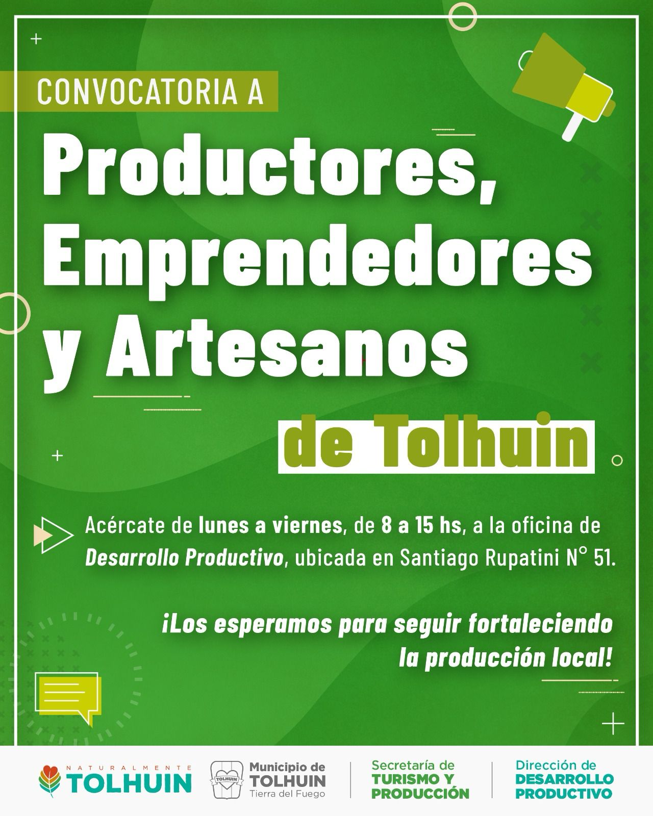 El Municipio de Tolhuin, a través de la Dirección de Desarrollo Productivo dependiente de la Secretaría de Turismo y Producción, lanzó una convocatoria dirigida a productores, emprendedores, artesanos y distintos actores del sector productivo local para actualizar sus datos y registrarse en el padrón municipal.