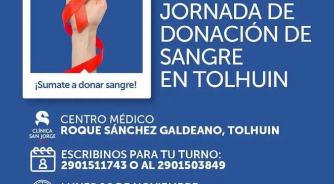 El Municipio de Tolhuin a través de la Dirección Municipal de Gestión y Promoción de la Salud Comunitaria, el Club del Donante y la Clínica San Jorge, invita a la comunidad a participar de la próxima jornada de donación de sangre, que se llevará a cabo el próximo lunes 6 de noviembre.