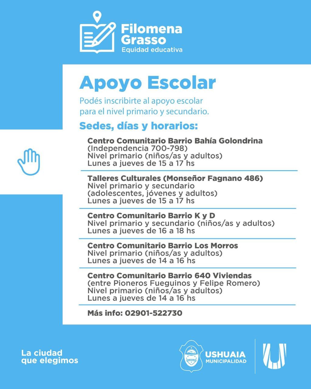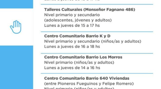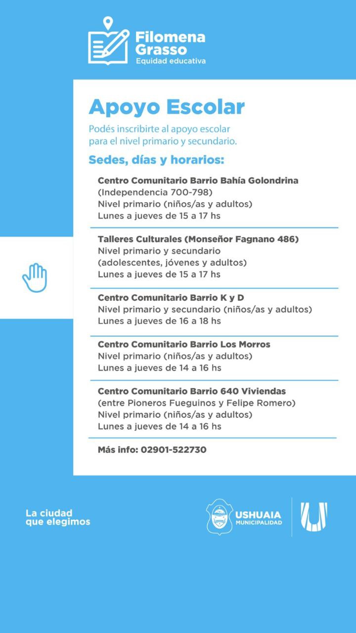 La iniciativa de acompañamiento socioeducativo integral que la Municipalidad de Ushuaia impulsa, se brindará en el Centro Comunitario del Barrio Bahía Golondrina de lunes a jueves de 15:00 a 17:00 horas para nivel primario tanto en niños, niñas como adultos; en los Talleres Culturales Municipales para los niveles primario y secundario de lunes a jueves de 15:00 a 17:00 horas; en el Centro Comunitario del Barrio KyD en los niveles primario y secundario de lunes a jueves de 14:00 a 16:00 horas; en el Centro Comunitario del Barrio Los Morros para nivel primario de niños, niñas y adultos de lunes a jueves de 14:00 a 16:00 horas y en el Centro Comunitario del Barrio 640 Viviendas en nivel primario de niños, niñas y adultos de lunes a jueves de 14:00 a 16:00 horas. Quiénes deseen acceder a más información, podrán comunicarse al 2901-522730.