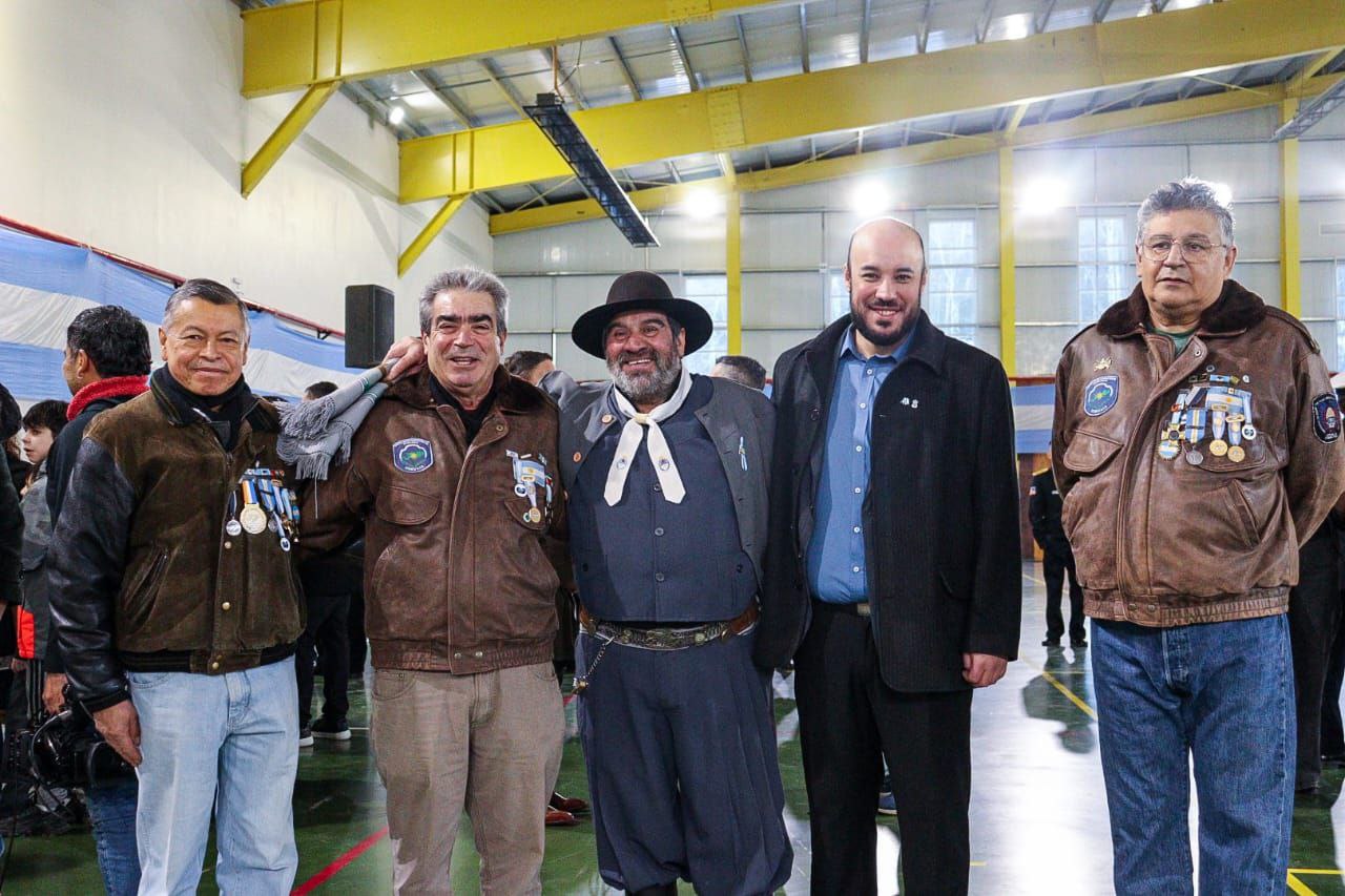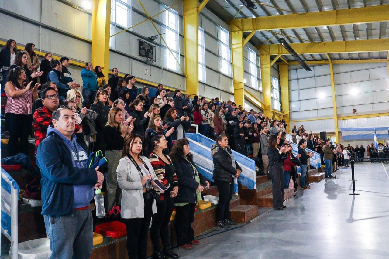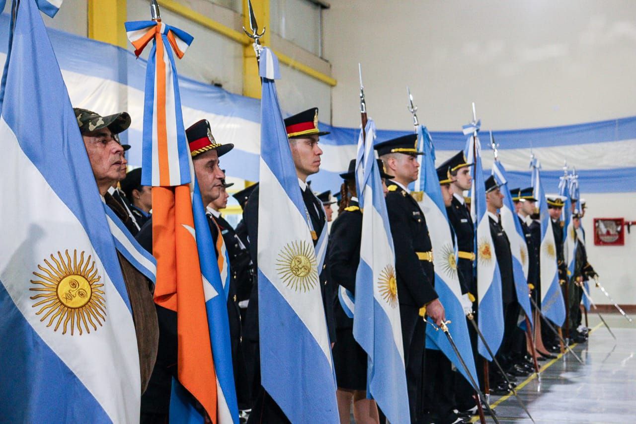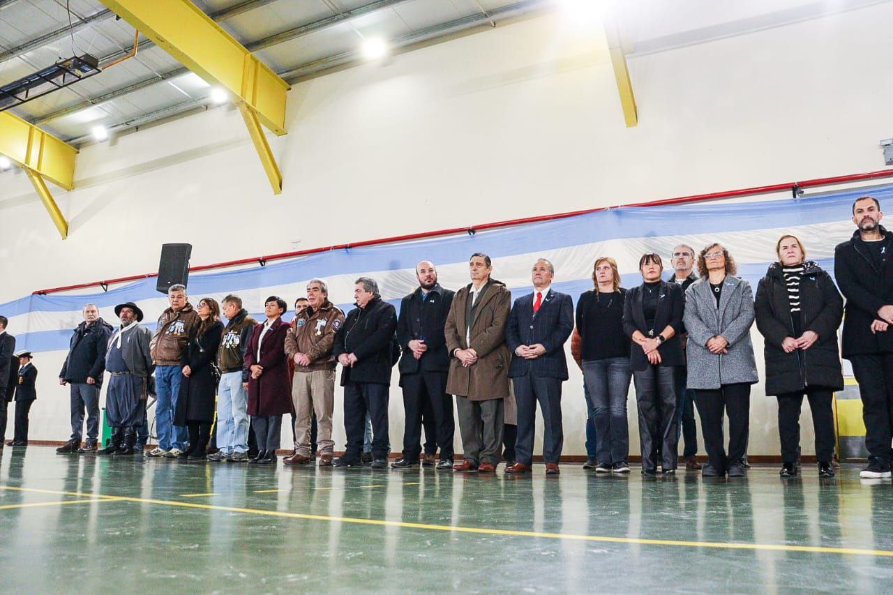 Al acto central que se realizó en la Casa del Deporte estuvieron presentes miembros de los poderes del Estado, excombatientes de Malvinas, integrantes de las fuerzas armadas y de seguridad, delegaciones de establecimientos educativos y grupos tradicionalistas, entre otros.