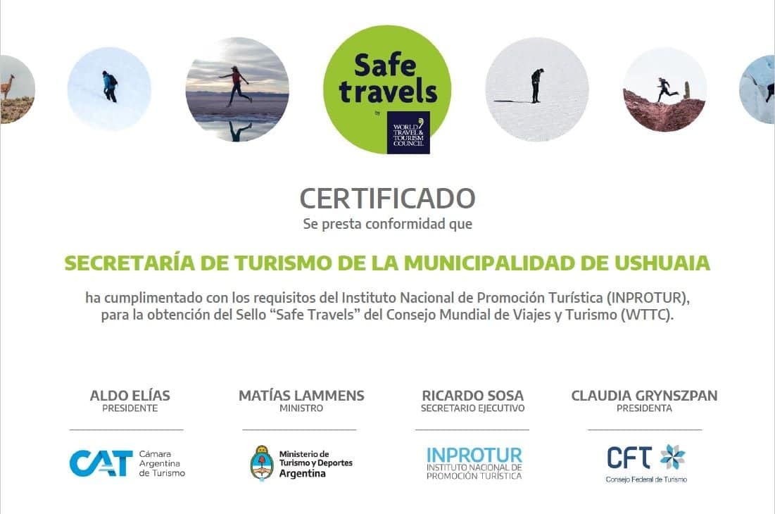 “El sello “Safe Travels” es una certificación internacional sobre las medidas de higiene y sanidad en las empresas del sector turístico e indica que una entidad turística cumple con los protocolos de seguridad emitidos por la OMS”, explicó Ferreyra y remarcó que “esto es muy importante para insertar Ushuaia en el circuito de Destinos Seguros”.