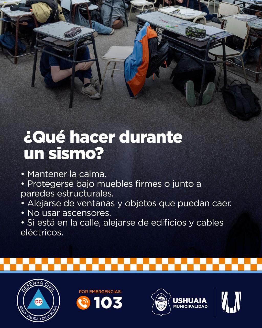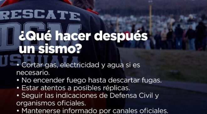 Ante este escenario, desde Defensa Civil de Ushuaia se solicita a los vecinos fortalecer las medidas de prevención y preparación comunitaria. En ese sentido, se recomienda elaborar un plan de acción familiar que implique establecer roles y responsabilidades para cada integrante del hogar en caso de sismo, definir puntos de encuentro seguros y realizar simulacros periódicos en la vivienda.