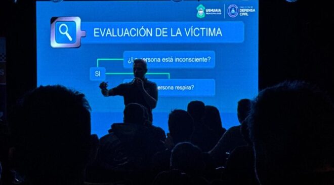 La formación tuvo lugar por más de cuatro horas y contempló a unas 170 personas que se desempeñan en el Puerto de Ushuaia. Allí, hubo instancias de material teórico y también de práctica, donde se hizo especial hincapié en la cadena de sobrevida y la atención inmediata de la persona que corre riesgo de vida.