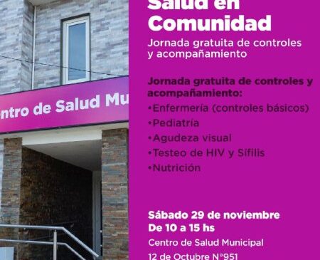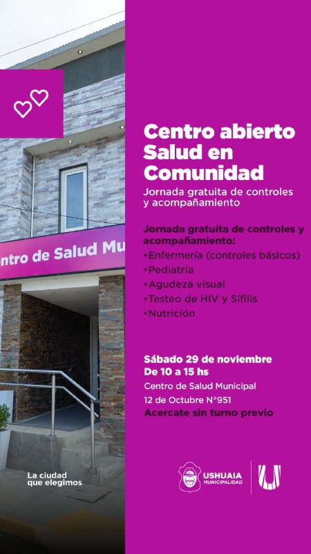 La Municipalidad de Ushuaia a través del Centro de Salud invita a los vecinos y vecinas a participar de la jornada “Centro Abierto – Salud en Comunidad”, la cual tendrá lugar por orden de llegada, en forma libre y gratuita el sábado 29 de noviembre de 10 a 15 horas, en la calle 12 de Octubre 951.