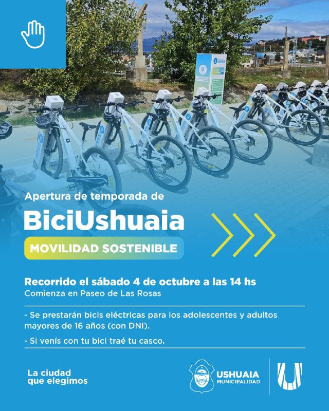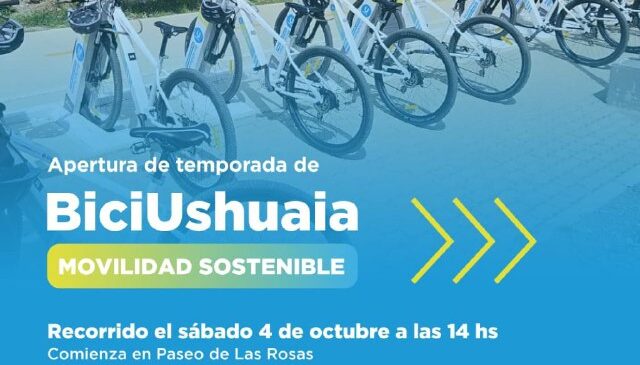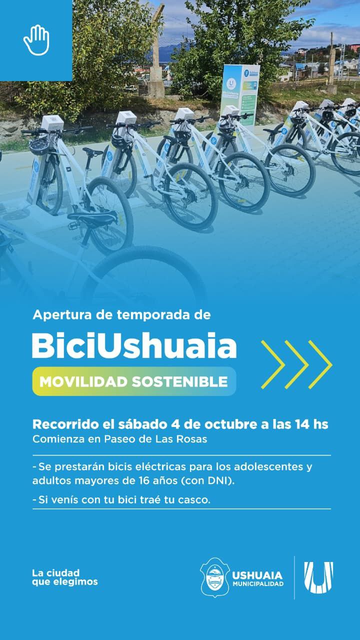 La Municipalidad de Ushuaia, a través del Instituto Municipal de Deportes, invita a los vecinos y vecinas a participar del lanzamiento de la segunda temporada de bicicletas eléctricas (BiciUshuaia), que se llevará a cabo el sábado 4 de octubre a las 14 horas en el Paseo de las Rosas.