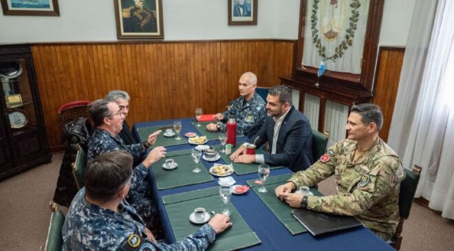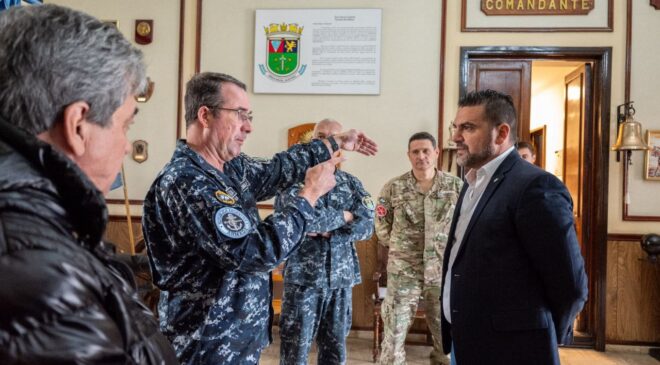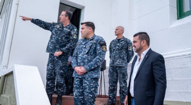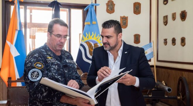 El intendente de Ushuaia, Walter Vuoto, se reunió junto al secretario de Relaciones Parlamentarias y Articulación Política del Municipio, Omar Becerra, con el comandante del Área Naval Austral y jefe de la Base Naval Ushuaia, capitán de navío Guillermo Prada.