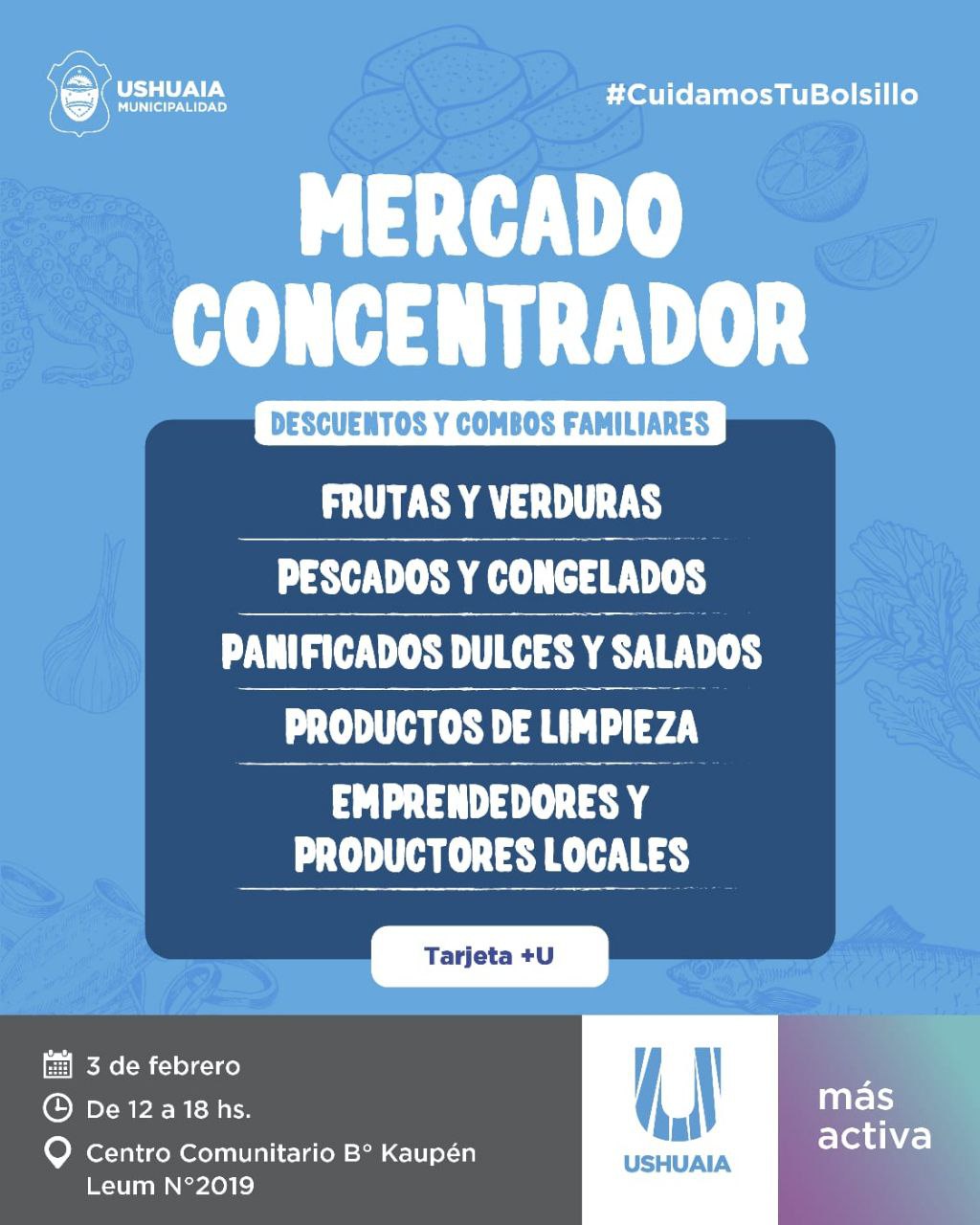 La Municipalidad de Ushuaia invita a los vecinos y vecinas a visitar el Mercado Concentrador para aprovechar promociones, combos familiares y descuentos con la Tajerta +U, el sábado 3 de febrero en el Centro Comunitario del barrio Kaupén Leum N°2019, en el horario de 12 a 18 horas.