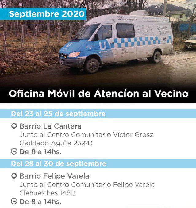 La unidad móvil de Atención al Vecino de la Municipalidad de Ushuaia reiniciará las actividades en distintos puntos de la ciudad para acercar respuestas y facilitar trámites a quienes necesiten ayuda en los distintos barrios. Este miércoles se ubicarán en el barrio La Cantera, junto al centro comunitario y permanecerán hasta el viernes 25, con atención de 8 a 14 horas.