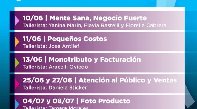El cronograma de talleres es el siguiente: Mente sana, negocio fuerte (10 de junio a las 18), Pequeños costos y organización financiera (11 de junio a las 18), Monotributo y facturación (13 de junio a las 18), Atención al público y ventas (25 y 27 de junio a las 18) y Fotoproducto (4 y 8 de julio a las 18).