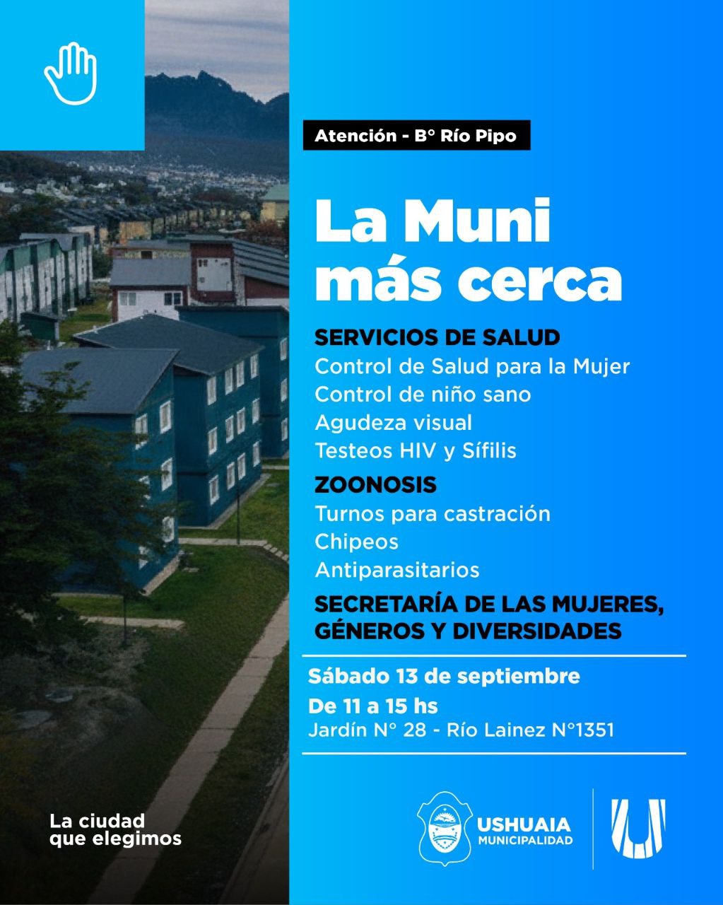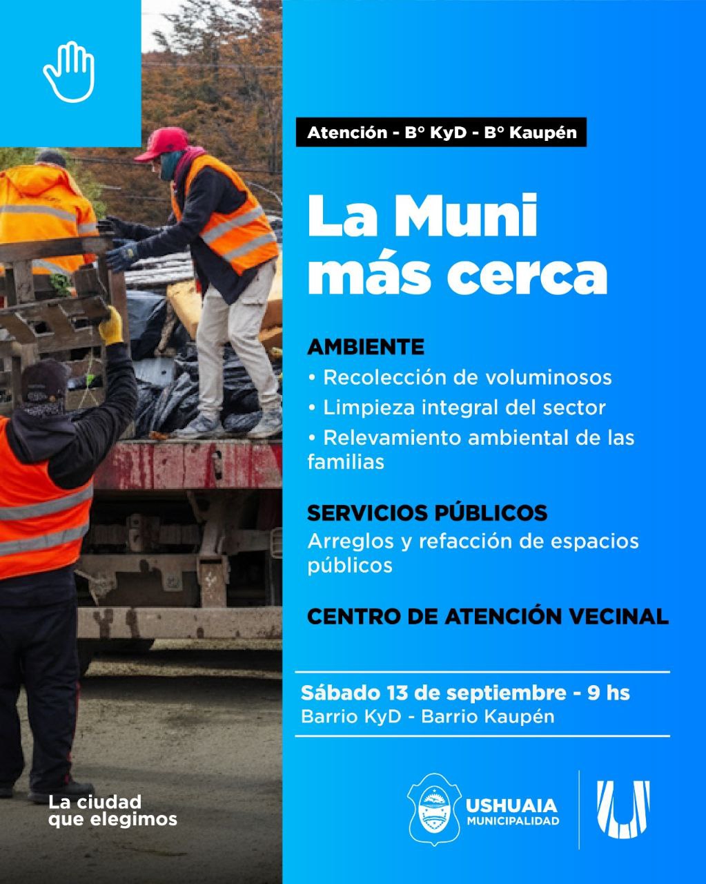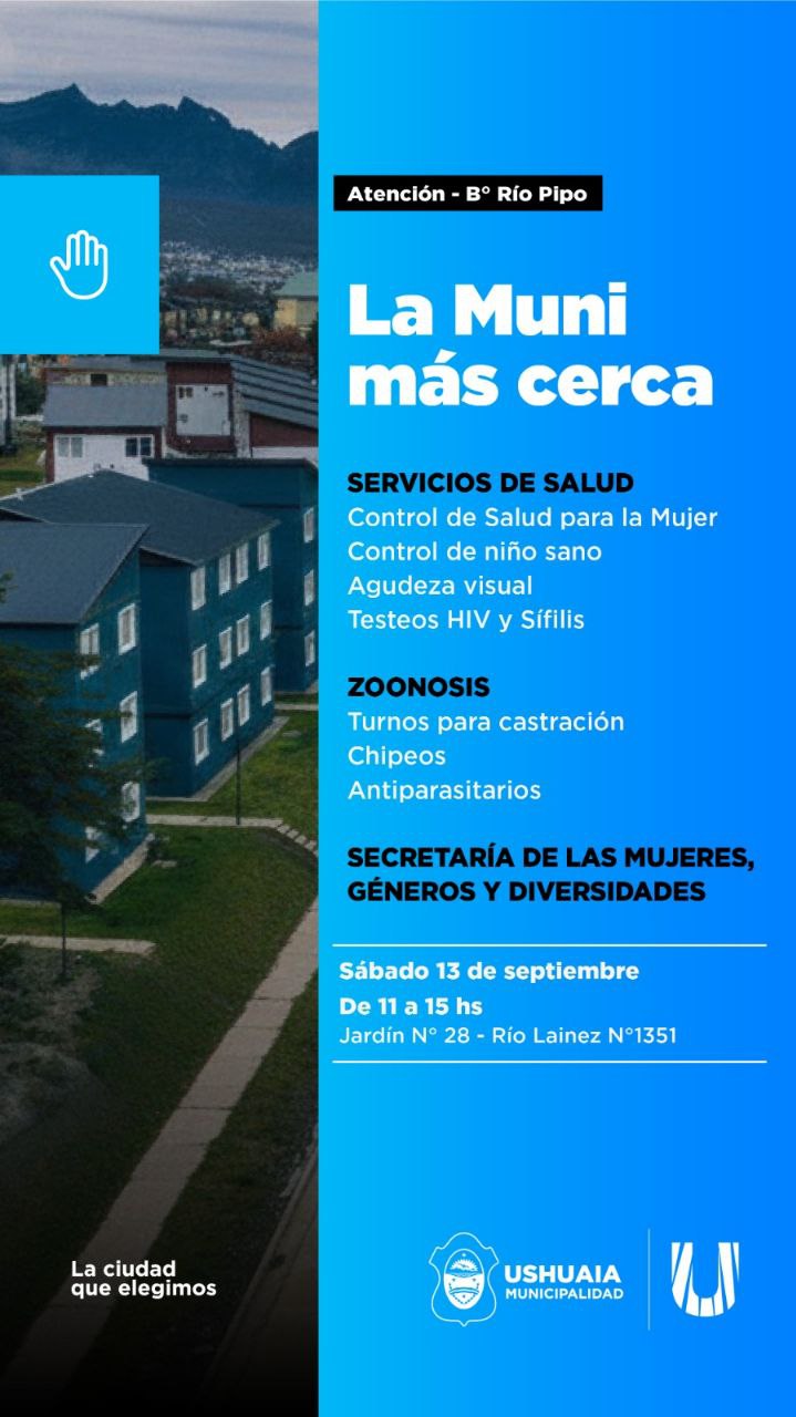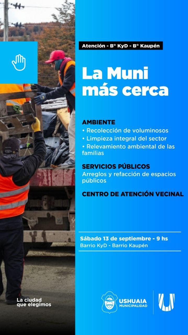 La Municipalidad de Ushuaia desplegará este sábado 13 de septiembre el dispositivo “La Muni más Cerca” en los barrios Pipo, Kaupén y el macizo KyD, con la presencia de distintas secretarías que acercarán servicios y prestaciones a vecinos y vecinas.