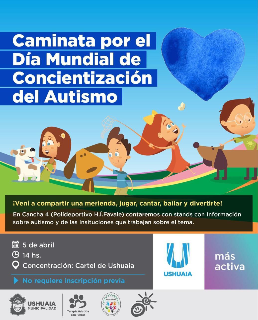 La Municipalidad de Ushuaia a través de Terapia Asistida con Perros (TAP), dependiente de la Secretaría de Políticas Sociales, Sanitarias y Derechos Humanos, junto al CAAD y la Escuela Kayú Chenen, invitan a los vecinos y vecinas a participar de la caminata por el Día Mundial de Concientización del Autismo.