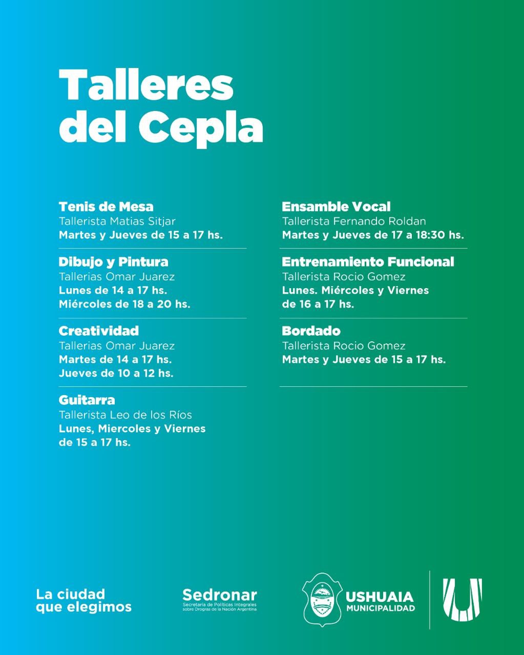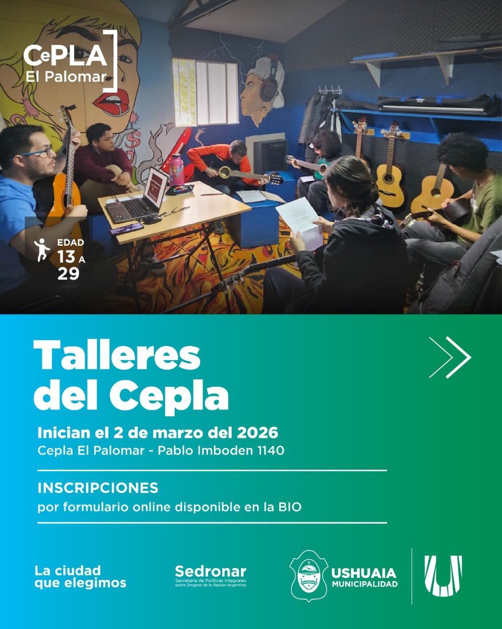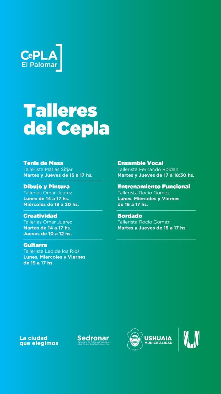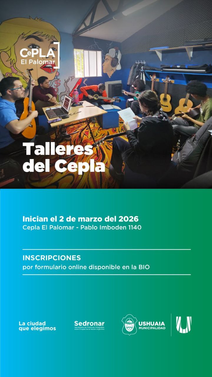 La Municipalidad de Ushuaia, a través de la Secretaría de Políticas Sociales, Sanitarias y Derechos Humanos, dará inicio el próximo 2 de marzo de 2026 a una nueva edición de los talleres gratuitos del CePLA El Palomar, destinados a adolescentes y jóvenes de entre 13 y 29 años.