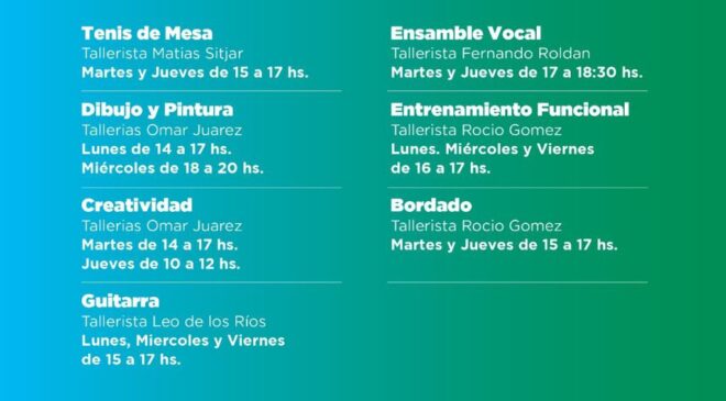 Durante este año se dictarán los siguientes talleres: Tenis de Mesa – Martes y jueves de 15 a 17 h. Tallerista: Matías Sitjar. Dibujo y Pintura – Lunes de 14 a 17 h y miércoles de 18 a 20 h. Tallerista: Omar Juárez. Creatividad – Martes de 14 a 17 h y jueves de 10 a 12 h. Tallerista: Omar Juárez. Guitarra – Lunes, miércoles y viernes de 15 a 17 h. Tallerista: Leo de los Ríos. Ensamble Vocal – Martes y jueves de 17 a 18:30 h. Tallerista: Fernando Roldán. Entrenamiento Funcional – Lunes, miércoles y viernes de 16 a 17 h. Tallerista: Rocío Gómez. Bordado – Martes y jueves de 15 a 17 h. Tallerista: Rocío Gómez.
