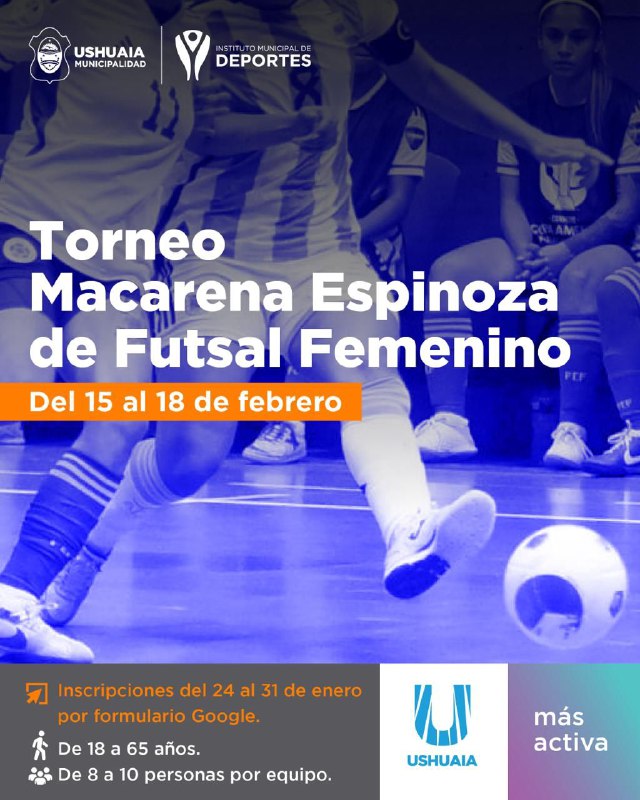 La Municipalidad de Ushuaia a través del Instituto de Deportes invita a las vecinas de entre 18 a 65 años, a participar del Torneo Relámpago de Futsal Femenino “Macarena Espinoza”, el cual tendrá lugar desde el 15 al 18 de febrero en el Microestadio José “Cochocho” Vargas y el gimnasio Hugo Ítalo Favale.