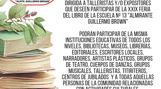 La Escuela Nº 13 “Alte. Guillermo Brown” organiza un gran Festival para disfrutar en familia, con la participación de artistas locales, grupos de baile folclóricos, bandas de música y cantantes. El cual se llevará a cabo el Sábado 19 de Octubre, desde la 20:00 hasta la 00:00 hs., en la Calle Gobernador Paz Nº 1811. Lo recaudado será destinado para la Vigésimo Novena Feria del Libro 2024, según informó la Bibliotecaria Sandra Iserre.