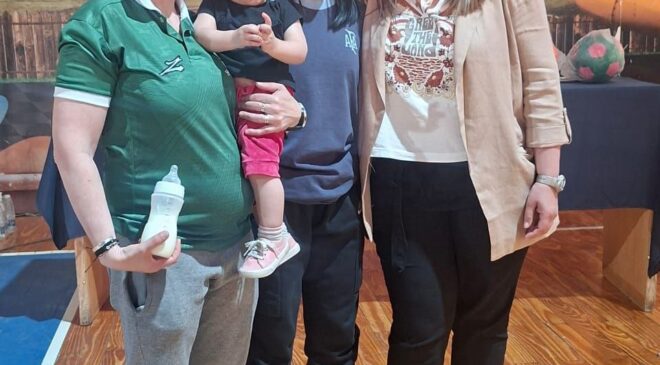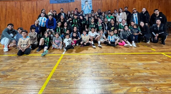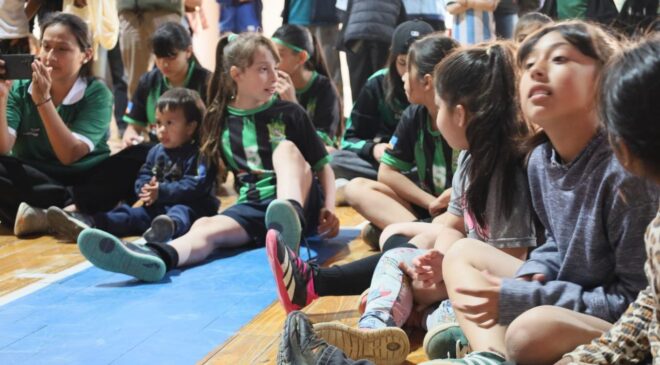Macarena Espinoza recibió el reconocimiento al Mérito Deportivo por parte del Concejo Deliberante y, una vez finalizada la charla, les enseñó a las niñas y niños presentes su característico movimiento conocido como “la balanza”. Luego, compartieron un partido recreativo de “todos contra todos”.